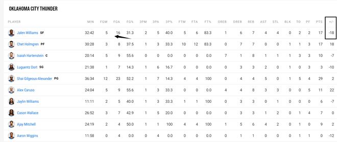 杰威在场-18雷霆最差,多尔特7中1(在场-10),亚历山大在场+2,霍姆格伦8中3(在场+18),杰威才是先发之中在场表现最差的那个。